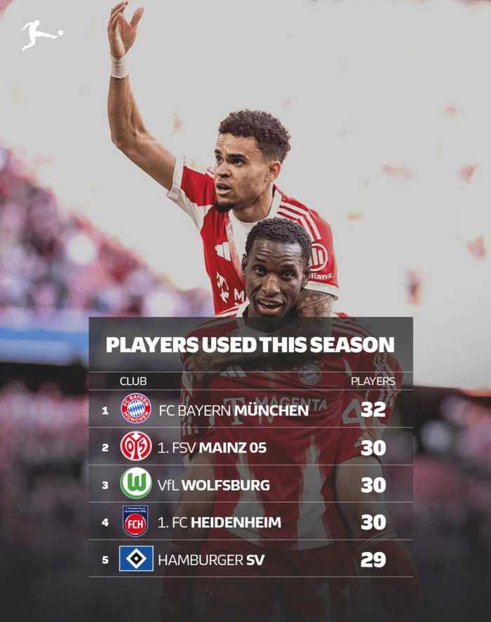 在这项榜单中,拜仁以32人高居第一,美因茨、沃尔夫斯堡和海登海姆均使用了30名球员,并列排在第二,汉堡则以29人位列第五。